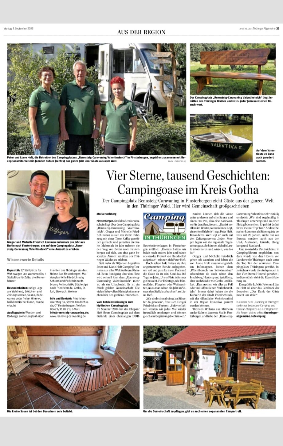 In unserer Tagszeitung TLZ wurde unser familiengeführter Campingplatz wunderschön vorgestellt. Leider befindet sich der komplette Text hinter der Bezahlschranke.